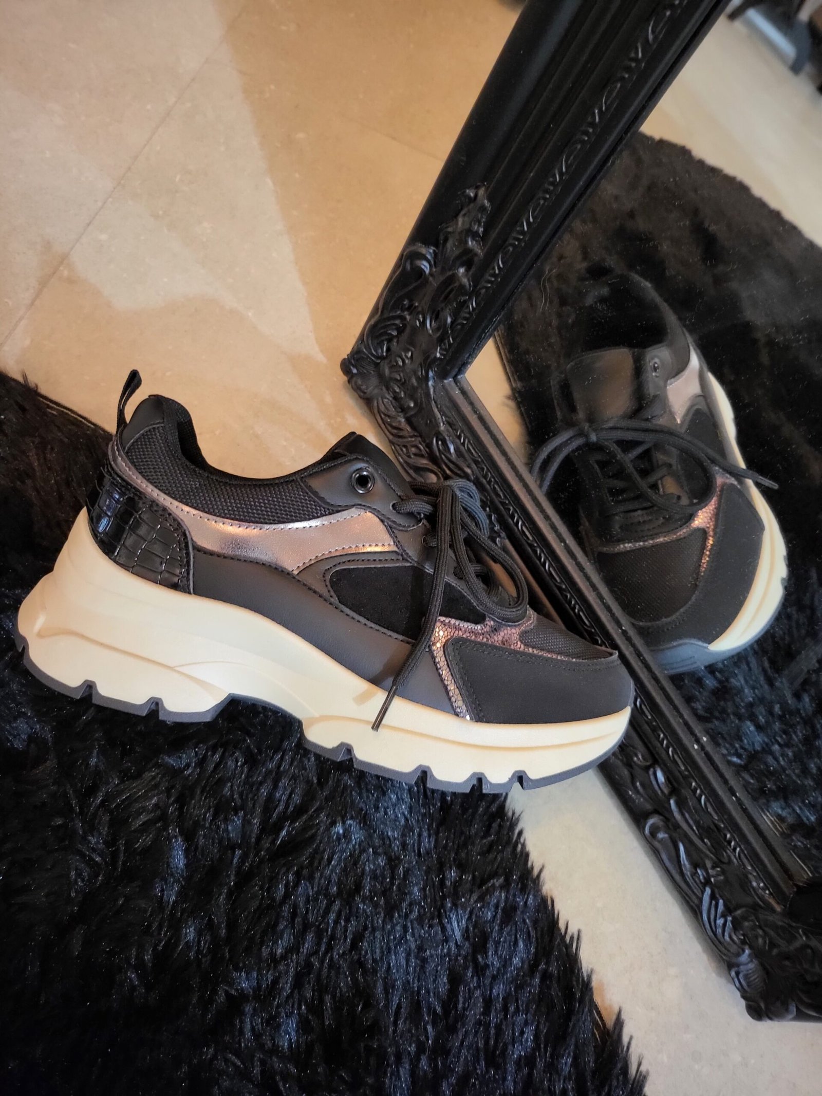 Couleur : Noir avec touches dorées et semelle beige contrastée
